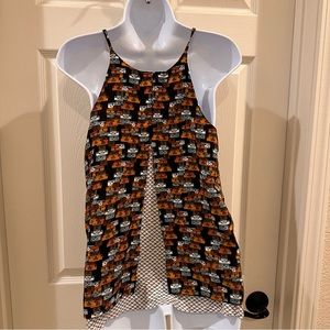 Sweet print of stacks of old time luggage. It brings you back to when days were simpler. This cute spaghetti strap double layered top with a split in the back top layer will bring a smile to your face and because of the amazing colors in the top it will be one you reach for time and again.