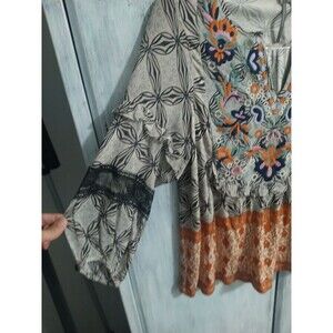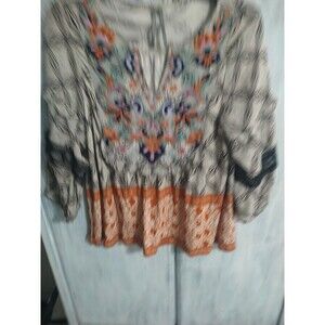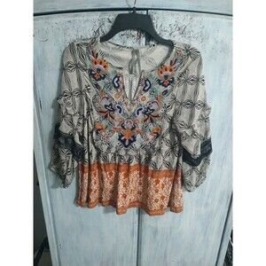 The Anthropology ruffled embroidered top in XS is a bohemian, feminine piece ideal for various occasions including travel, weddings, parties, casual outings, workwear, and business meetings. Made from viscose material, this blouse features 3/4 sleeves and a pullover closure. The multicolored embroidery adds a whimsical and cottage core touch to the basic style, perfect for all seasons. Anthropologie's brand ensures quality and attention to detail, making this top a versatile and stylish addition to any woman's wardrobe.