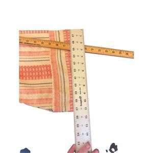 Pink, beige, and cream striped tunic top with geometric accents. Features a scoop neckline, 3/4 length sleeves, and two large front patch pockets. Relaxed fit, made from 100% cotton. Size small. Made in USA. anthropology. Measurements are in the photos
