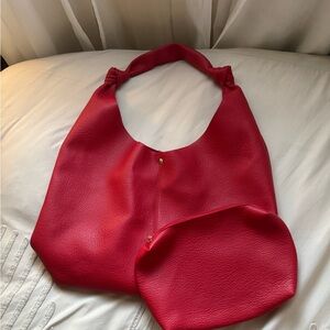 Like new! I only used this 2x. Elegant cherry red leather tote with knotted handle design. Perfect for everyday use. Comes with a matching small pouch.