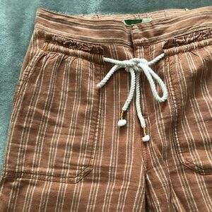 Anthropology light peachy orange and cream stripe pants size Xsmall in great condition Linen Blend / elastic back waist / drawstring detail at pockets/ has front and back pockets/ hem can be folded or unfolded