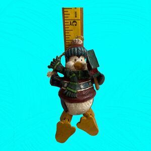 Anthropomorphic Christmas Penguin Ornament made of Resin. He is holding a Birdhouse in his hand. He is 5" tall. His arms and legs are jointed and he can sit.