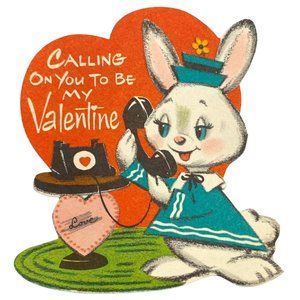 Anthropomorphic Rabbit Valentine Greeting Card Telephone Diecut 4" Vintage 1940s Good condition with some edge wear and pencil writing on back. Measures about 4" tall. Please see pictures for condition. If you have any questions, please let me know.