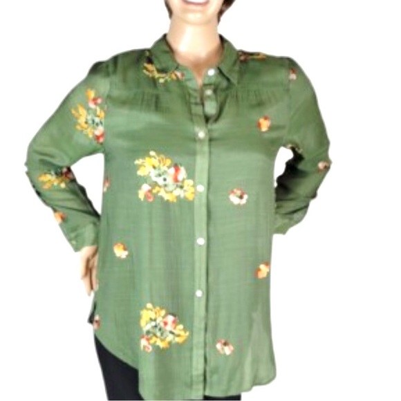Anthro’s Fig and Flower Green Embroidered Long Sleeve Button Down Shirt,Size S