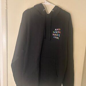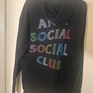 This stylish sweater from Anti Social Social Club features a striking multicolor gradient text on the back, creating a vibrant contrast against the black and blue fabric. The classic pullover design ensures comfort and a trendy look, making it a standout piece in any wardrobe. -- Has bleach damage on one sleeve. Still in great conditon