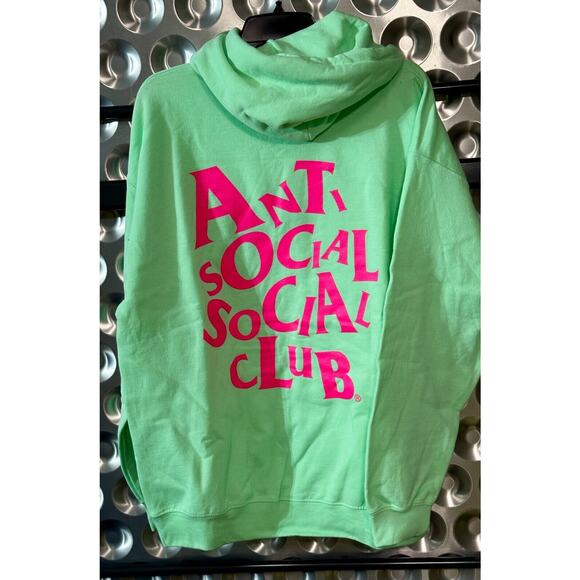 Elevate your streetwear game with this designer Anti Social Social Club hoodie. The pullover style features a drawstring closure and a relaxed fit, with a solid green color and a round neckline. The hoodie is made of high-quality materials and is perfect for gym and training, walking, or basketball. It's a size Large and authentic, from the Anti Social Social Club brand. This hoodie is the perfect addition to any wardrobe, and is sure to turn heads. Made in the United States, this hoodie is a must-have for any fashion-forward man.