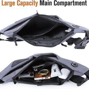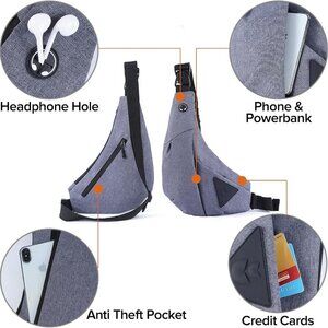 Multiple Storage Purpose Sling Bag Rationally organized space, multiple sized pockets at various angles, easy access to all your essentials. Main zipper pocket has compartmentalized separate spaces to organize small items, includes a small zipper pocket, a inner pocket, a card slot and two open slot. Organize small basic items well. 2 Front zipper pocket allows you to store cellphone, keys, wallet and so on. An earphone hole on the top of this sling bags men enables you to enjoy music easily.