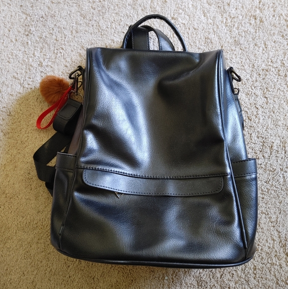 Black backpack that has no access in the front except for a small pocket in front the main opening will be towards your back. Helps for places that are crowded and if your worried about pick picketers.Never been used. Adjustable straps