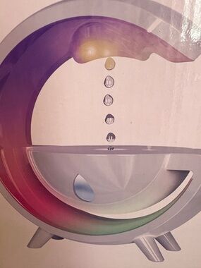 Modern anti-gravity humidifier with a curved G-shaped design. Gradient purple to pink accent with subtle green and teal highlights. LED-lit water droplets detail. Sleek silver/gray base and trim.