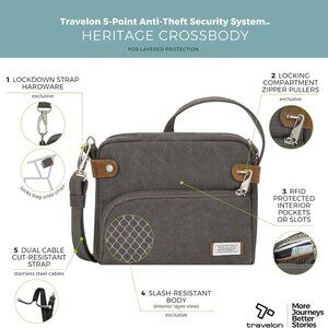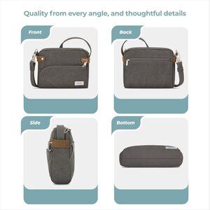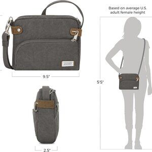 Saftty and security meet style in this unisex crossbody bag, designed with anti-theft features that keep your belongings safe — perfect for travel or everyday errands. Crafted from durable cotton canvas with rich suede accents, it's both sturdy and chic, and only gets better with age. The sleek pewter color adds a modern touch. Lightweight at just under a pound but packed with smart storage, including RFID-protected pockets, front zip, rear slip pockets, and an interior tethered key clip. The adjustable stainless steel strap can be secured to a stationary object, giving you extra peace of mind. Features a secure zipper closure, slash-resistant panels, and nickel-plated hardware for durability and style. Comfortable to wear over your shoulder or crossbody, with a practical size that fits all your essentials with ease. Perfect for travel, daily use, or a hands-free outing. Dimensions: 9.5 W x 8 H x 2.5 D inches, Strap Drop: 13 inches, Strap Length: 53 inches, Weight: 0.9 lbs. Ships promptly from a smoke-free, pet-free home. Reasonable offers welcome. Bundle & save!