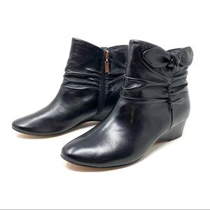 Ooh and awe at this ankle boot with a wedge working to elevate style. The ruched leather design adds a touch of edge to any ensemble, while a prim bow at the top keeps things feminine.
