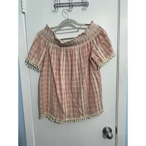 Antibes Blanc Blouse Small Pink Striped Textured Off The Shoulder Fringe Boho, great condition.