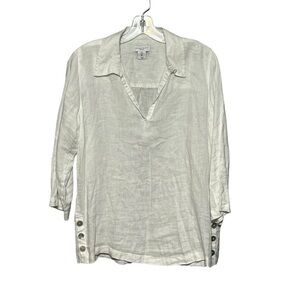 Antibes Blanc Linen Popover Top White Long Sleeve Shirt Lagenlook Button Tunic