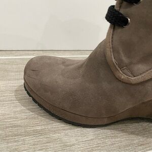 Antica Cuoieria Suede Taupe Neutral Platform Wedge Retro Lace Up Bootie.