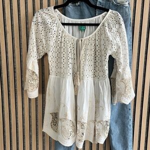 This elegant cream cotton lace and eyelet top is perfect for any occasion. Its intricate design adds a touch of sophistication to your wardrobe- I bought this while in Sorrento last year - it is so pretty - the tag says one size but it is definitely best for a small or x-small - it is 100 percent cotton