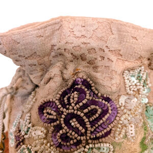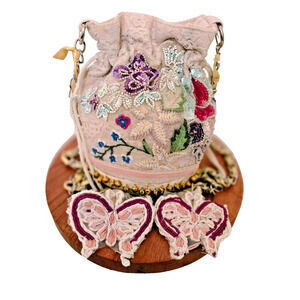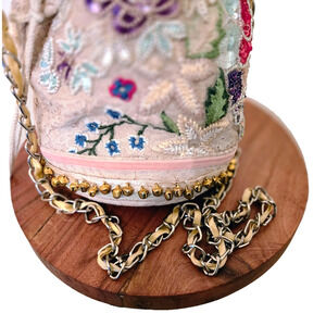 The Antica Sartoria Positano Round Beaded Bag Purse is a small clutch with a floral pattern and vibrant multicolor exterior. It features a drawstring closure, along with beaded accents and bells for added charm. The bag is lined with ivory cotton and has a chain handle with a satin ribbon.This boho purse is perfect for adding a colorful touch to any outfit, making it a must-have accessory for any fashion-forward woman.