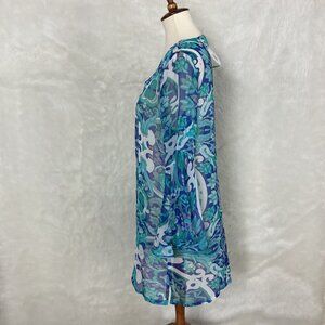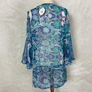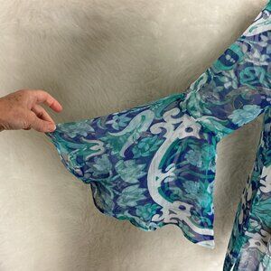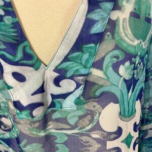 This is a blue, white & green floral & bird print, sheer, v-neck, long bell sleeves swim cover-up from Antica Sartoria by Giacomo Cirque. 100% polyester. NWT, bnwt, brand new with tags. No flaws, but, the stitching looks off to me on the neckline, pictured. For reference the mannequin is a size 6-8 with measurements of: 34 in 26 in 35 in.