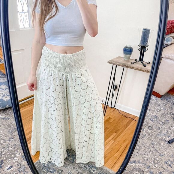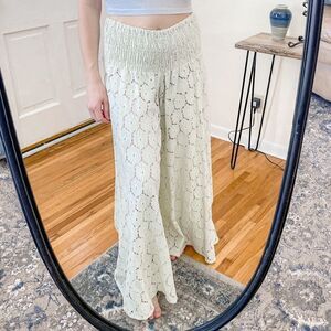 Features wide leg, sheer crochet lace, unlined, wide elastic waist band, pretty teal/ mint color
