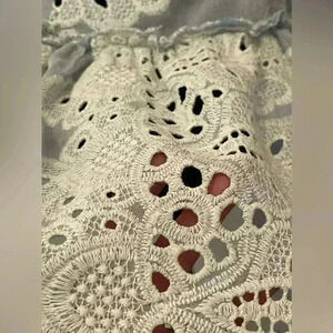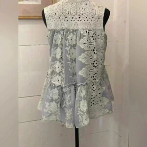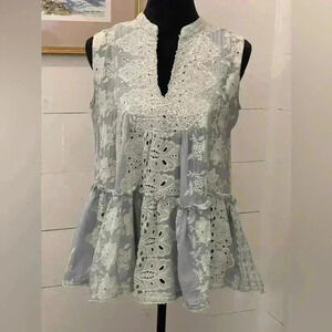This is a beautiful, detailed top with eyelet lace. The front of the top has white beads and sequins to make an interesting shimmer . Sleeveless size, medium and good condition. Light blue, and white. Generous, boxy fit.