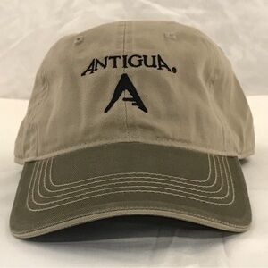 F9 Hat/Cap Antigua Adult Adjustable Strap with Clasp Antigua type & "A" on face in brown/Tan with light green bill with tan thread accents on bill 100% Cotton Baseball Beach