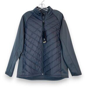Antigua women’s full-zip performance jacket in size Large. Sleek heather gray with quilted insulated front and stretch knit sleeves and back for ease of movement and lightweight warmth. Features zippered hand pockets, mock neck, and embroidered “Fox Sports” logo on the left sleeve. Perfect for layering, workouts, or casual wea. New With Tags.