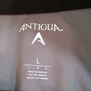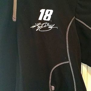 buy Antigua Kyle Busch number 18 size large long sleeved black pullover with gray inside and gray Embellishments 100% polyester good shape the gray embellishments go down the neckline around the collar the end of the sleeves and the bottom of the coat and there are two zippered pockets on both sides