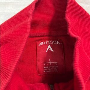 Experience comfort and style with this Antigua red zip-up sweater, featuring a quarter-zip design and ribbed cuffs for a snug fit. The bright red color and casual design make it perfect for both athletic and leisure activities. A subtle white logo on the chest adds a touch of elegance to this versatile piece.