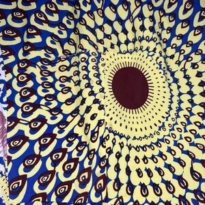 Main colors are bright cobalt blue, yellow, brown and white. A mix of stripes, leopard print, batik circles and dots.