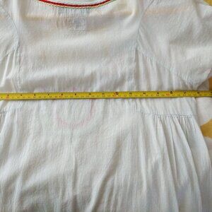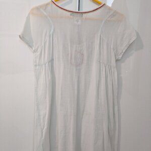 Vintage Antik Batik tunic top with embroidered neckline, scoop neck, and seaming details. Size 38 (French) is a true Small. Please check dimensions: Measured flat, shoulder seam to shoulder seam is 14 1/2", pit to pit is 17 1/2", and the length from shoulder to hem is 31 1/2". Featherweight cotton is white with a subtle hint of blue, and almost sheer in the light. Could be worn as a minidress if you dare. Floaty hippy chic. Good vintage condition. No particular issues/normal wear consistent with age.