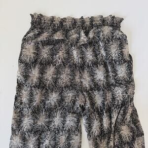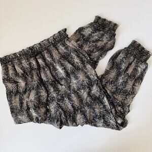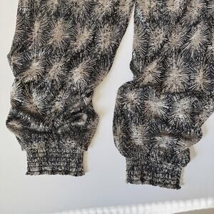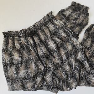 - black stretch fabrication with metallic silver burst details, pull-on drawstring elastic waist, jogger style, pockets, paperbag waist, smocked ankle, slouchy silhouette, lined