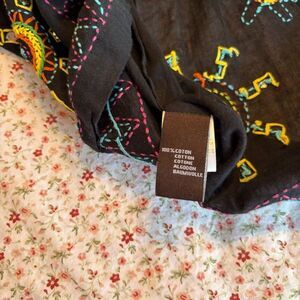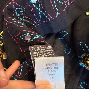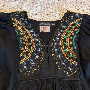 Black blouse with colorful stitching. Features pink, blue, and yellow patterns.