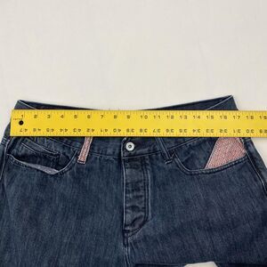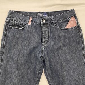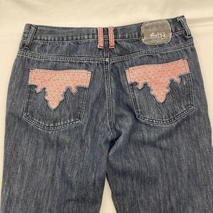 Good pre-owned condition with light wash wear and no holes or stains observed. Embroidery/appliqué intact; zipper and button work properly. Frayed look on the waistband label appears to be part of Antik Denim's design. See photos for full condition details.