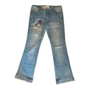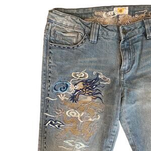 A gorgeous pair of dragon embroidered denim jeans by Antik Denim. Flare/Boot cut style. Size 28. 99% cotton 1% spandex. Stretch to the material. Light Wash. Some wear at the bottom (pictured) otherwise great condition.