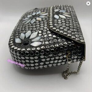 This Antik Kraft metal clutch is absolutely stunning and sure to attract TONS of compliments! Featuring beautiful Mother of Pearl details with metal studs throughout, this unique piece showcases rustic markings that highlight its handcrafted, bohemian style—no defects, but character. Perfect for a night out, festivals, weddings, vacations, and more. This bag securely snaps closed - which is very unique. The crossbody chain can be removed to transform it into a clutch. Sold out both online and in stores, it is the ultimate IT GIRL bag. The materials shimmer and shine from every angle, reflecting the designer’s timeless, ethical boho style. Designed in Los Angeles, this bag is full of texture and character.