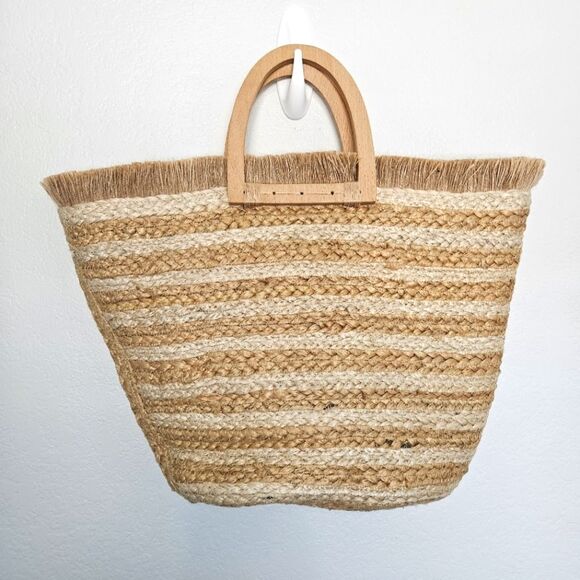 Antik Kraft Anthropologie | Jute Hashree Straw Tote Wooden Handles Womens