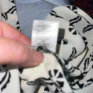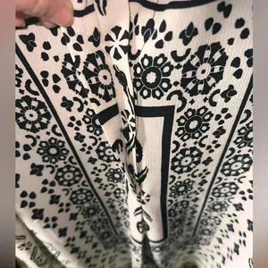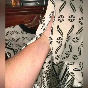 Roll up and button sleeves, black trim around neckline and sleeves. Hidden buttons down front. Great black and off white print. Made in India. 100 % polyester. Front darts on chest to give shape. Measures 27” pit to pit , length 30” . Would be great worn with velvet leggings or wide leg trousers! Travels beautifully.. doesn’t wrinkle easily . Note.. it doesn’t button all the way up to neckline, buttons don’t start for approx 5” down