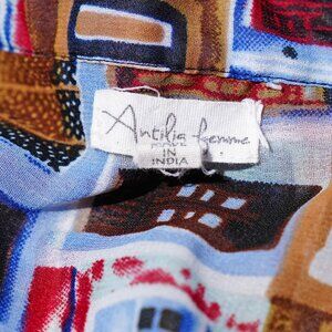 This is a fun and unique novelty print blouse by Antilia Femme. It features a colorful, all-over pattern of what looks like different doors and windows in various colors like blue, red, brown, and tan. The top has a V-neckline and short cap sleeves. The fabric is lightweight and made in India. This is a perfect top for someone who loves unique and artistic patterns. Size L.
