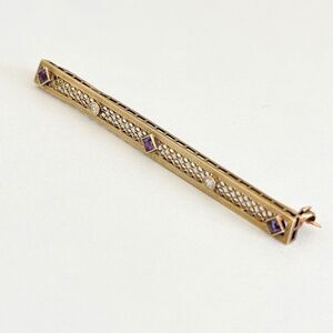 Antique 14K Solid Yellow Gold Intricate Detail Amethyst & Diamond Bar Brooch Pin