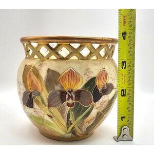 This exquisite Robert Hanke porcelain vase from 1893 showcases detailed orchid and butterfly motifs, reflecting the craftsmanship of its era. The intricate latticework on the rim and the vivid hand-painted design make it a remarkable collector's piece. Its antique charm and artistic significance are undeniable, a true testament to Hanke's legacy.