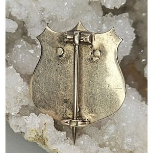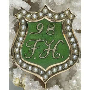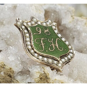 Antique 1898 Solid 9k Yellow gold Shield Pin - Green Enamel & Seeded Pearl - F.H