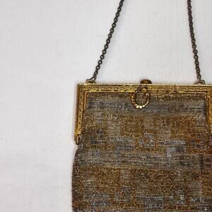 Antique 1900s French Micro-Steel Seed Bead Purse Gold Toned Metal Frame AS IS