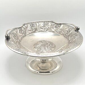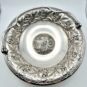 This ornate footed dish features deeply embossed Rococo Revival floral and scroll detailing with a central grape motif, and a hinged handle.