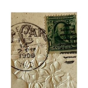 Antique 1908 Ephemera Valentine Postcard Embossed Hearts And Posies Wicker Box Patel colors. Made in Germany. Some wear and discoloration from age. Some wear on edges and corners. See all images.