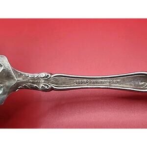 This antique serving spoon is from the 1881 Rogers La Vigne pattern, featuring an Art Nouveau style. Made of silverplate, this solid smooth casserole spoon measures 8 7/8 inches in length. The piece dates back to 1908, placing it in the early 20th century. The intricate design and elegant craftsmanship of this silverware reflect the beauty and sophistication of the Art Nouveau period, making it a valuable addition to any antique collection.