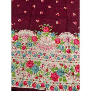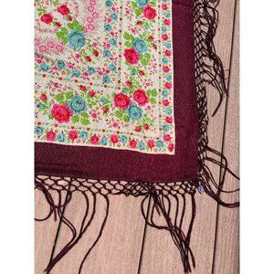 Antique 1909 Romanian Textile Art Wool Floral Shawl Hand Tied Fringe Floral Pattern Maroon Pink Blue 128" x 43"
