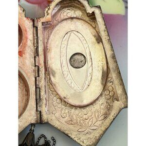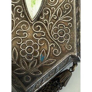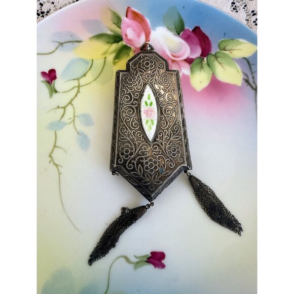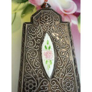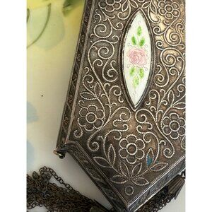 This exquisite antique compact coin purse from the 1910s features a silverplate guilloche enamel design, perfect for collectors and vintage enthusiasts. Its timeless elegance makes it a unique addition to any collection. This is being sold as is. It is missing some parts. It is missing one tassel at the bottom. I am not sure if it is missing anything inside but please see photos. I think it may have had some enamel painting on the floral parts as there is some paint there. I also pbelieve it must have had a chain or strap to carry. It measures 3 3/4" x 1 3/4". It doesn't not have any dents. All flaws are minor. Overall in good working condition.