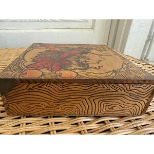 Antique 1910s Flemish Art Pyrography Hanky Box Art Nouveau Lady Cherries