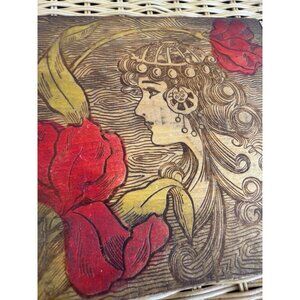 Antique 1910's Flemish Art Pyrography Hanky Box Art Nouveau Lady with Flowers