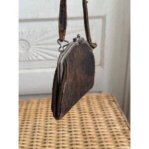 This charming antique mini leather purse from the 1910s features a classic kiss lock closure and a top handle design. Its worn, shabby look adds to its vintage appeal, making it a unique collectible or accessory. This little purse measures 5x3.5" The inside is cotton and is intact but is coming loose by the frame. It has an attached mirror which is still pretty clear but has a sepia tint. The frame is aged and the leather as well. I am not sure how usable this is due to the aged appearance but would make a nice little display piece .