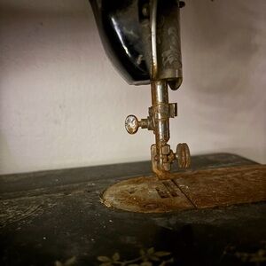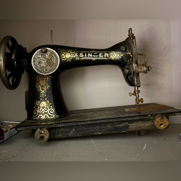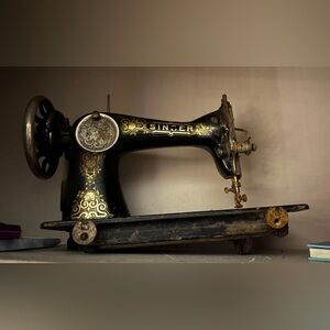 Antique Singer sewing machine with intricate gold detailing. Classic black finish.